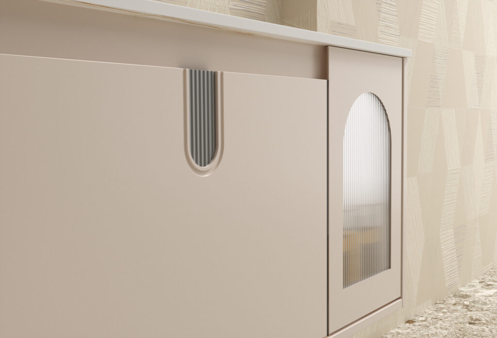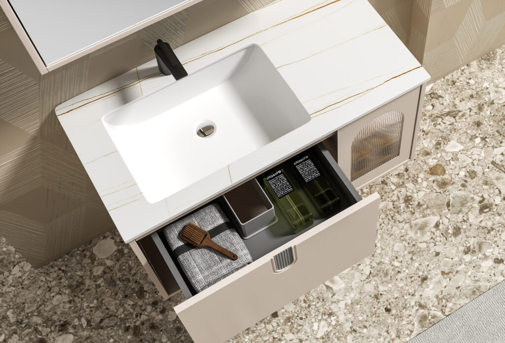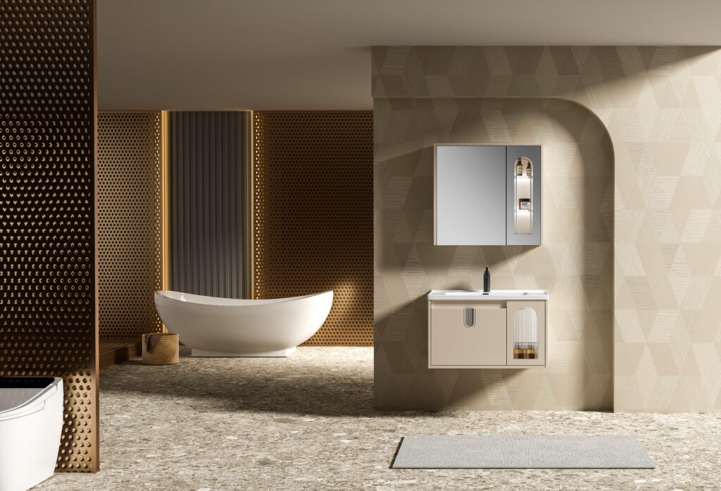 Beige Modern Bathroom Cabinet with Glass – door Design for Commercial Hotel Projects