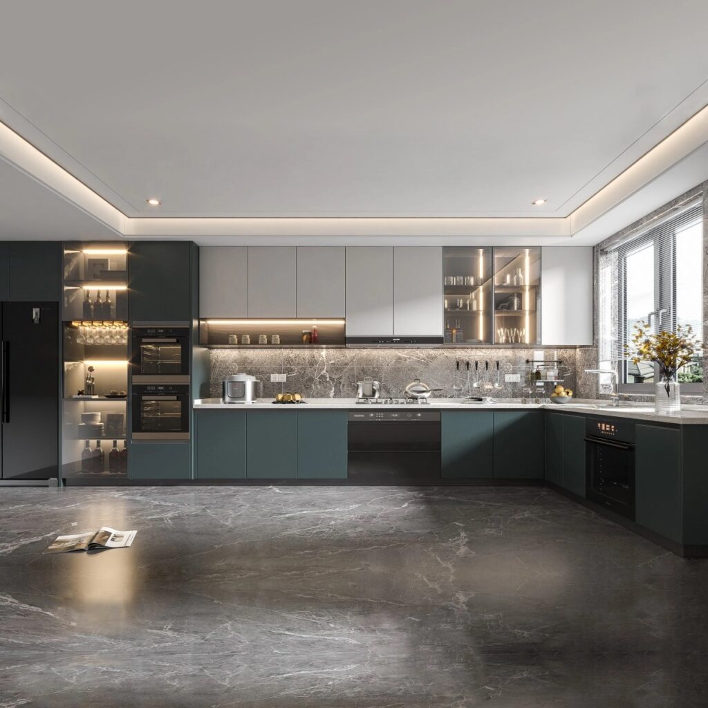 Black and Wood U-Shaped Two Tone Particle board Cabinets
