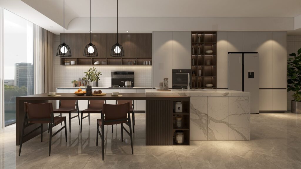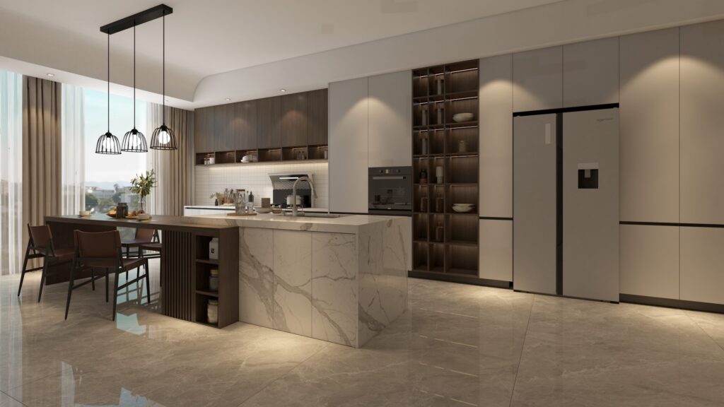 Lacquer Modern Light Gray Kitchen Cabinets With Island